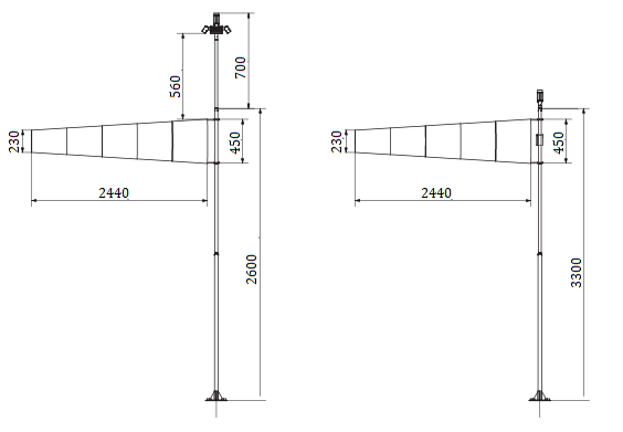 Wind Indicator Masts are available in 3.3m, 6.6m and 7.2m tall and can be customized on request: The 6.6m and 7.2m provided with tiltable mast.